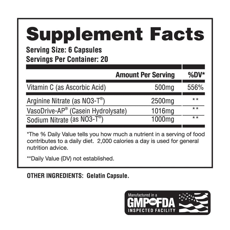 VasoDrive-AP® (Casein Hydrolysate) - 1016mg: This patented ingredient works on a separate mechanism to ensure vessels remain open. It inhibits the enzyme that causes blood vessels to constrict, resulting in relaxed, flexible arteries for superior circulation, nutrient delivery, and pump quality.